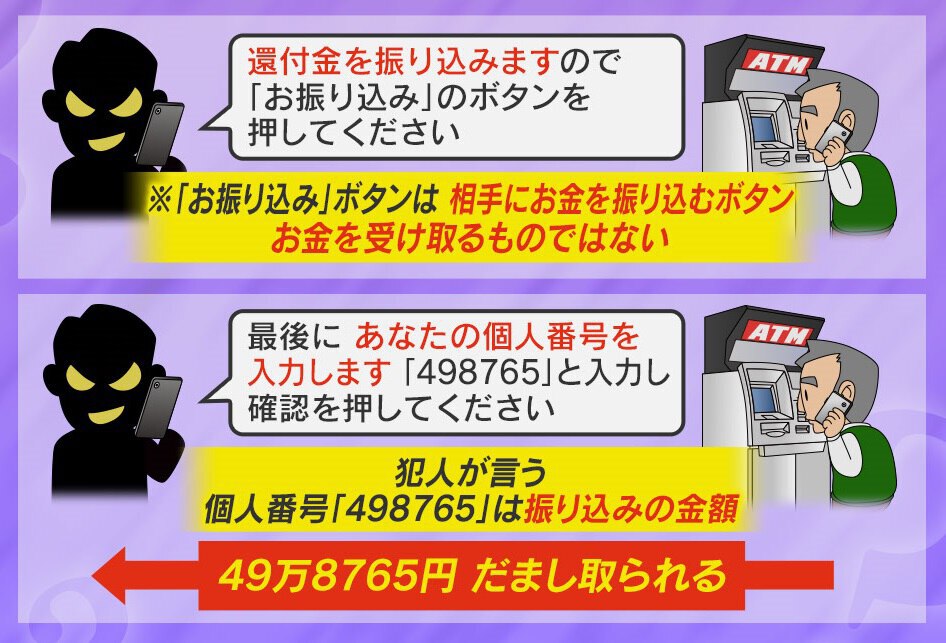 そして、「還付金を振り込みますので、『お振り込みボタン』を押してください」と言ってきます。もちろん、この『お振り込みボタン』は“相手にお金を振り込む”ものです。さらに「最後にあなたの個人番号を入力します。498765と入力し、確認を押してください」と言われますが、この数字は、先ほど聞いた残高照会の金額より、すこし少なめの数字。これを入力してしまうと、49万8765円を知らない人に振り込み、騙し取られてしまうという仕組みです。