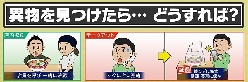 もし店内で飲食しているときに異物を見つけたら、店員を呼び、一緒に確認してください。テークアウトの場合は、すぐに店に連絡し、商品は捨てずに保管して、動画・写真に保存するなど証拠を残すようにしてください。