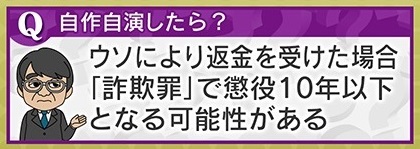 では、自作自演だったら、どんな罪になるのか?亀井弁護士は、「ウソにより返金を受けた場合、『詐欺罪』で懲役10年以下となる可能性がある」と指摘します。