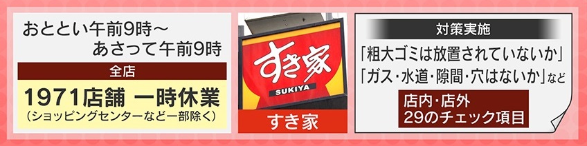 これらを受けて『すき家』は、同年3月31日午前9時~4月4日午前9時にかけ、全店(ショッピングセンターなど一部除く)1971店舗で一時休業。「粗大ゴミは放置されていないか」「ガス・水道・隙間・穴はないか」など、店内・店外29のチェック項目を確認し、対策を実施しました。