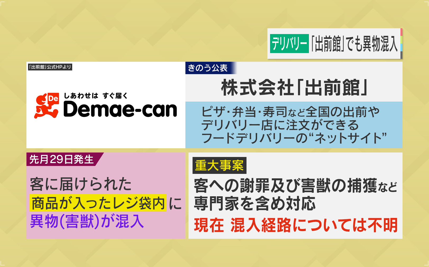 また、フードデリバリーの“ネットサイト”『出前館』が、2025年3月29日に客に届けられた商品が入ったレジ袋内に異物(害獣)が混入していたと、同年4月1日に公表しました。これを重大事案として、客への謝罪及び害獣の捕獲など専門家を含め対応しましたが、同年4月2日現在、混入経路については不明です。