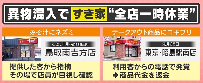 2025年1月、『すき家』鳥取南吉方店で、「みそ汁にネズミが混入している」と提供した客から指摘があり、その場で店員が目視し確認(ただし公表は同年3月22日)。また、同年3月28日には東京・昭島駅南店で、テークアウト商品にゴキブリが混入していたことが利用客からの電話で発覚し、商品代金を返金したということです。