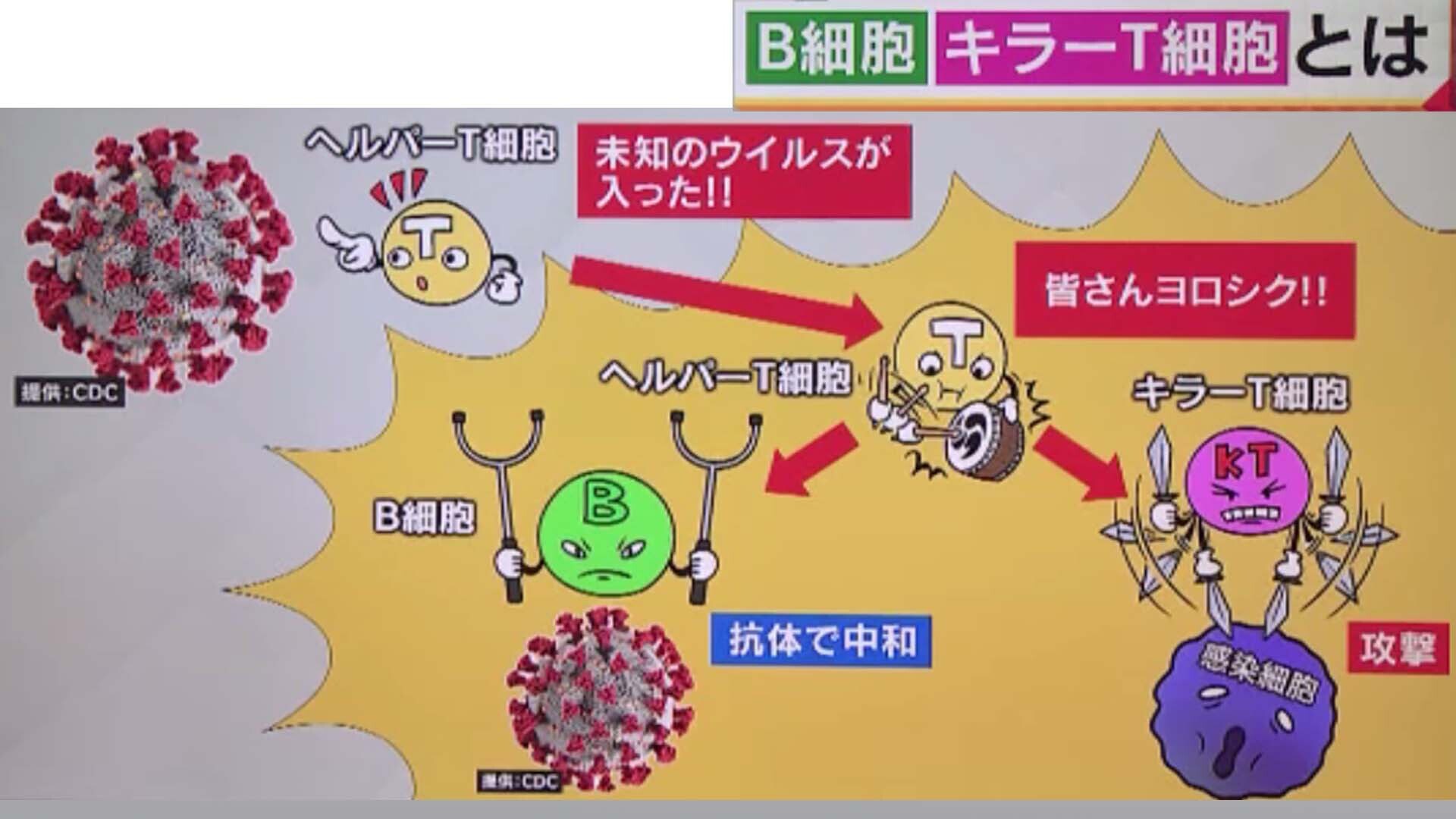 抗体はウイルスに付着して増殖する能力を無力化し、感染を防いで”中和”します。ただし抗体の量には個人差があり、量が少ないとウイルスの細胞への侵入を防ぎきれない場合があるのです。すでに感染してしまった細胞には抗体は効かないため、今度はヘルパーT細胞の指示で「キラーT細胞」が反応し、感染した細胞ごとウイルスを破壊します。