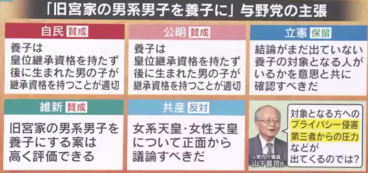 「要は、生まれた時から国民が存じ上げているといいますか、“皇室で生まれて育った方が大切だ”という考えです。また、養子の対象になる方が、場合によっては養子に『入れ』とか『入るな』とか、そういった外からの圧力は当然考えられますし、週刊誌を中心にいろいろとプライバシーに踏み込まれるだろうなと。そういうものを乗り越えて養子に入っていただける方がいらっしゃるのか、私は疑問を持っています」