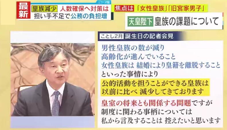 天皇陛下は2024年2月の記者会見で、皇族の課題について「男性皇族の数が減り、高齢化が進んでいること、女性皇族は結婚により皇籍を離脱することといった事情により、公的活動を担うことができる皇族は、以前に比べ減少してきております。皇室の将来とも関係する問題ですが、制度に関わる事柄については、私から言及することは控えたいと思います」と語りました。