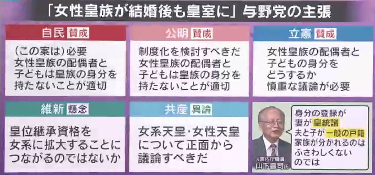 案①『女性皇族が結婚後も皇室に』に対する与野党の主張ですが、自民党・公明党は「女性皇族の配偶者と子どもは、皇族の身分を持たないことが適切」と賛成、立憲民主党は「女性皇族の配偶者と子どもの身分をどうするかは、慎重な議論が必要だ」とするも賛成、日本維新の会は「皇位継承資格を女系に拡大することにつながるのではないか」と懸念を示し、共産党は「女系天皇・女性天皇について正面から議論すべきだ」と異論を唱えています。