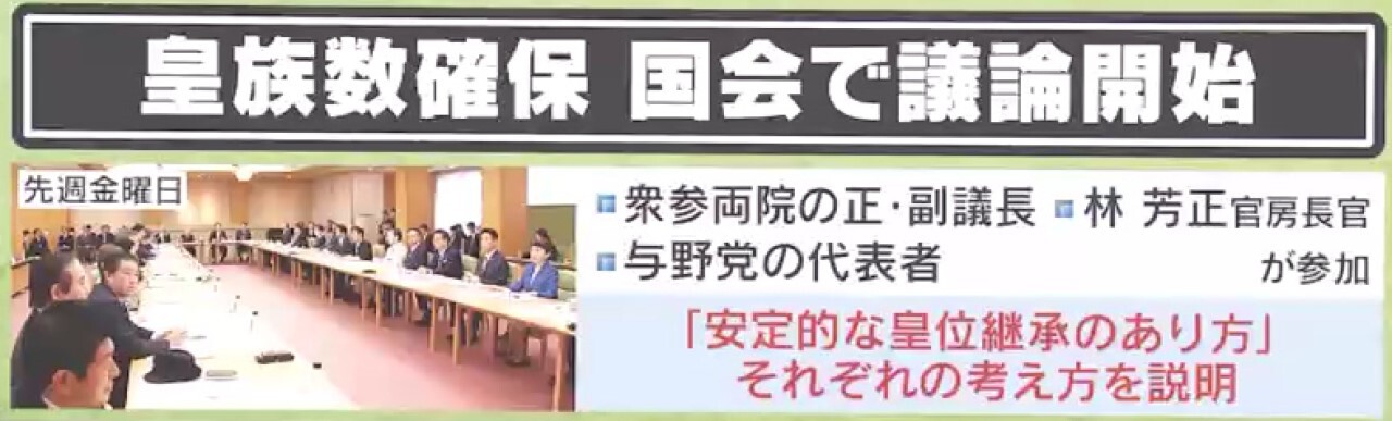 2024年5月17日、皇族数確保へ国会で議論が始まり、衆参両院の正・副議長、林芳正官房長官、与野党の代表者が参加。「安定的な皇位継承のあり方」について、それぞれの考え方を説明しました。