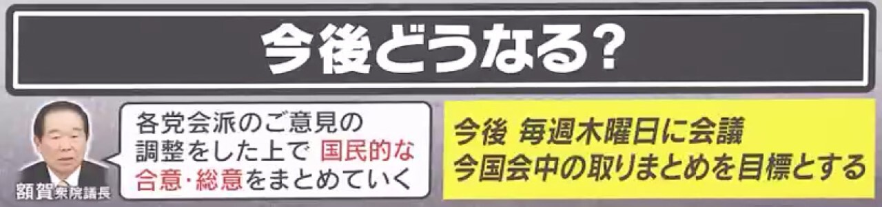 額賀衆院議長は「各党会派の御意見の調整をした上で、国民的な合意・総意をまとめていく」としていて、今後は毎週木曜日に会議をし、今国会中の取りまとめを目標としています。