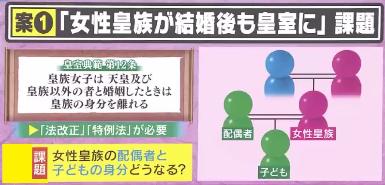 案①『女性皇族が結婚後も皇室に残る』は、現在の皇室典範には「皇族女子は天皇及び皇族以外の者と婚姻したときは、皇室の身分を離れる」とあり、法改正・特例法が必要となります。また、これが認められたとしても、「女性皇族の配偶者と子どもの身分がどうなるか」にも課題が残ります。