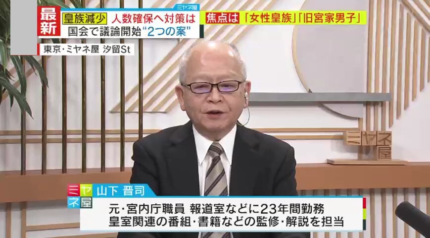 現在、未成年の皇族は悠仁さま一人となっている状況の中、国会で皇族減少対策の議論が始まりました。“2つの案”が出ていますが、どちらにも課題が…。果たして、今後どうなるのか?元宮内庁職員・山下晋司氏の解説です。