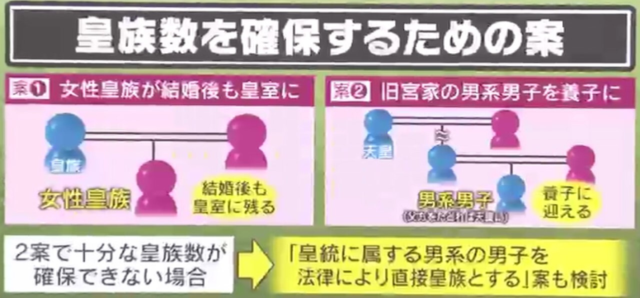 皇族減少対策として検討されているのが、案①『女性皇族が結婚後も皇室に残る』、案②『旧宮家の男系男子を養子に迎える』という2つの案です。この2案で十分な皇族数が確保できない場合は、「皇統に属する男系の男子を、法律により直接皇族とする案」も検討されています。ただ、2つの案には、どちらも課題があります。