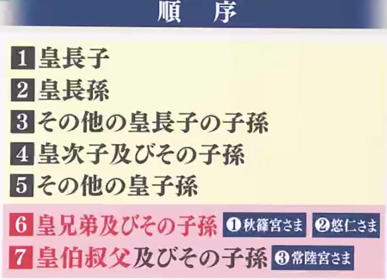 皇室典範によると、皇位継承資格を持つのは『男系男子』で、順序は①皇長子②皇長孫③その他の皇長子の子孫④皇次子及びその子孫⑤その他の皇子孫となっていますが、現在これらに当てはまる方はおらず、秋篠宮さま・悠仁さまは⑥の『皇兄弟及びその子孫』に、常陸宮さまは⑦の『皇伯叔父及びその子孫』に当てはまります。これを踏まえ、現在の皇位継承順位は第1位が秋篠宮さま、第2位が悠仁さま、第3位が常陸宮さまとなっています。