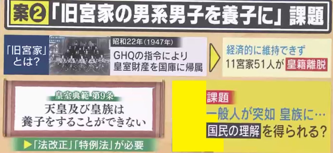 戦後、昭和22年(1947年)にGHQの指令により皇室財産を国庫に帰属したことにより、経済的に維持できず11宮家51人が皇籍離脱、旧宮家となりました。皇室典範には「天皇及び皇族は養子をすることができない」とあり、案②『旧宮家の男系男子を養子に』についても法改正・特例法が必要です。また、「一般人として過ごしてきた方が突如皇族になることに、国民の理解を得られるのか」という課題もあります。
