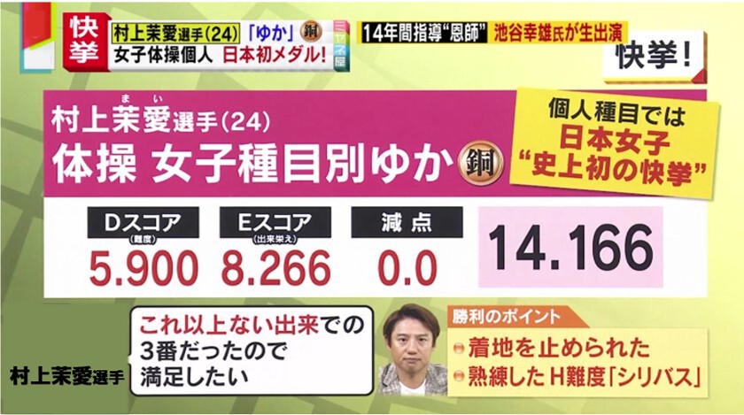 「村上茉愛やりました銅メダルです。日本女子体操57年ぶりのオリンピックメダル、村上茉愛が掴み取りました」