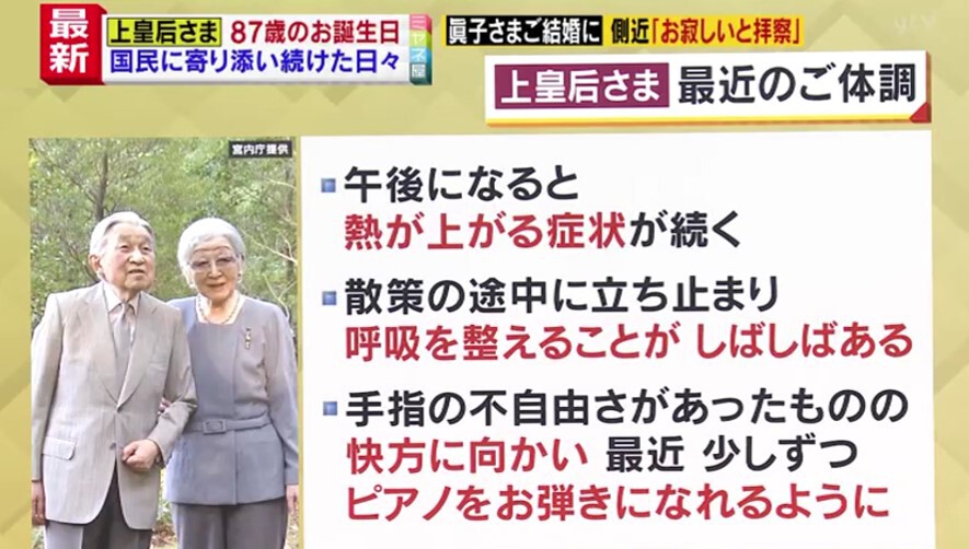 宮内庁によりますと、美智子さまは朝夕の散策のほか、朝食後の本の音読を毎日続けるなど規則正しい日々を送られています。体調については、2020年から午後になると熱が上がる症状が続いているものの、手や指の不自由さは快方に向かい、この1、2か月は、少しずつピアノを弾かれているということです。