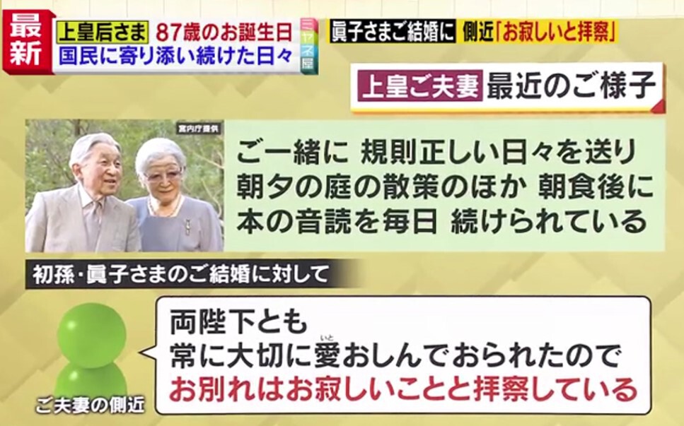「眞子さまは、両陛下にとってはじめてのお孫さんなわけですよね。美智子さまは、お孫ができて、非常にうれしいと。子どもたちに接するのとは違って、孫と接する喜びはまた格別ですとおっしゃったことがあるんです。」