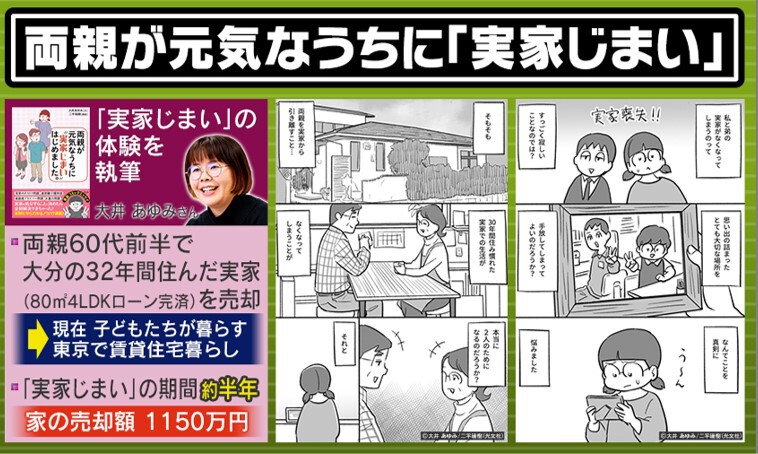 メディア運営系の会社代表でライターの大井あゆみさんは、「実家じまい」の実体験を執筆し、半年にわたった実家の整理について紹介しています。大井さんは両親が60代前半で、32年間住んだ大分県の実家を売却し、現在は子ども達が暮らす東京で、賃貸住宅に暮らしています。大井さんから両親へ「実家じまい」を提案したということですが、そこに至るまでには「両親を住み慣れた実家から離すことが、本当に2人のためになるのだろうか?」「私と弟の実家がなくなってしまうのは、すごく寂しいことなのでは?」という葛藤もあったと言います。