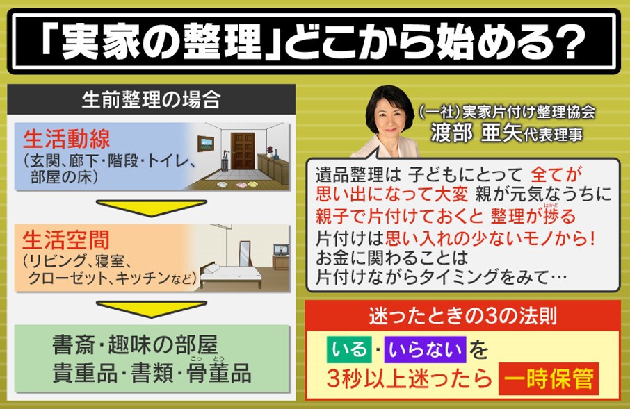 (一社)実家片付け整理協会の渡部亜矢代表理事は「片づけは思い入れの少ないモノから!」としていて、実家の整理はまず生活動線(玄関・廊下・階段・トイレ・部屋の床)から始め、その次に生活空間(リビング・寝室・クローゼット・キッチンなど)、そして書斎・趣味の部屋など時間のかかるところを後にすると、はかどるということです。処分に迷うときは「いる」「いらない」に分け、3秒以上迷ったら「一時保管する」という3つの法則で進めることを提言しています。