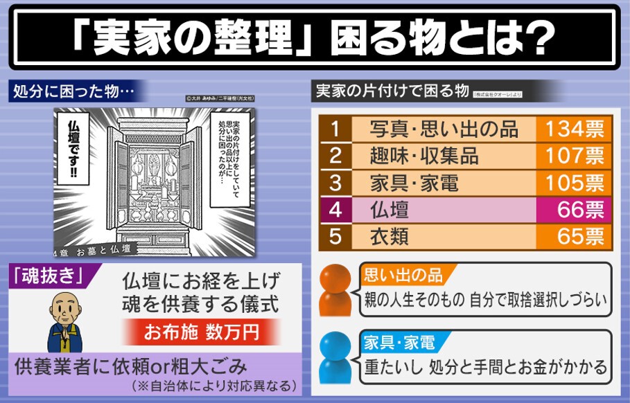 実家の整理をする中で、大井さんが一番処分に困ったものは「仏壇」だと言います。仏壇を処分する場合、まずは「魂抜き」という、仏壇にお経をあげて魂を供養する儀式のために、お布施が数万円かかり、さらに供養業者に依頼するか、自分で粗大ごみに出す選択をしなくてはならないということです。