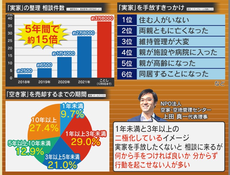 実家の整理の相談件数は、2018年は約2500件でしたが、2022年は12月9日までの時点で約3万8000件に上り、5年間で約15倍と急増しています。実家を手放すきっかけは、「住む人がいない」「両親ともに亡くなった」「維持管理が大変」などが多くあげられています。また、空き家を売却するまでの期間について、上田さんは「相談から1年未満と3年以上の二極化しているイメージ。実家を手放したくないと相談に来るが、何から手をつければいいか分からず、行動を起こせない人が多い」と言います。