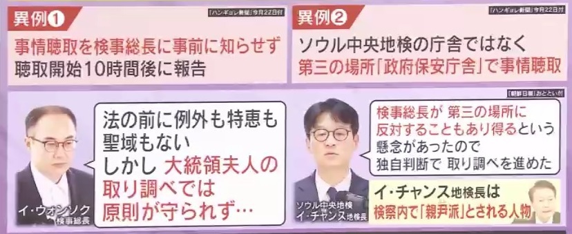 そんな中、キム・ゴンヒ氏への事情聴取は異例尽くめとなりました。『ハンギョレ新聞』によると、検察のトップであるイ・ウォンソク検事総長はこの事情聴取を事前に知らされておらず、報告は聴取開始から10時間後だったといいます。イ・ウォンソク検事総長は「無視された」と激怒し、「法の前に、例外も特恵も聖域もない。しかし、大統領夫人の取り調べでは、原則が守られず…」と話しました。