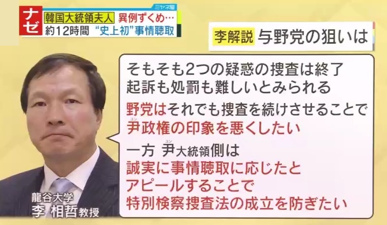 朝鮮半島情勢に詳しい龍谷大学・李相哲教授は、「そもそも2つの疑惑の捜査は終了していて、起訴も処罰も難しいとみられる。ただ野党は、それでも捜査を続けさせることで、ユン政権の印象を悪くしたい。一方、ユン大統領側は“誠実に事情聴取に応じた”とアピールすることで、『特別検察捜査法』の成立を防ぎたい」との見解を示しています。