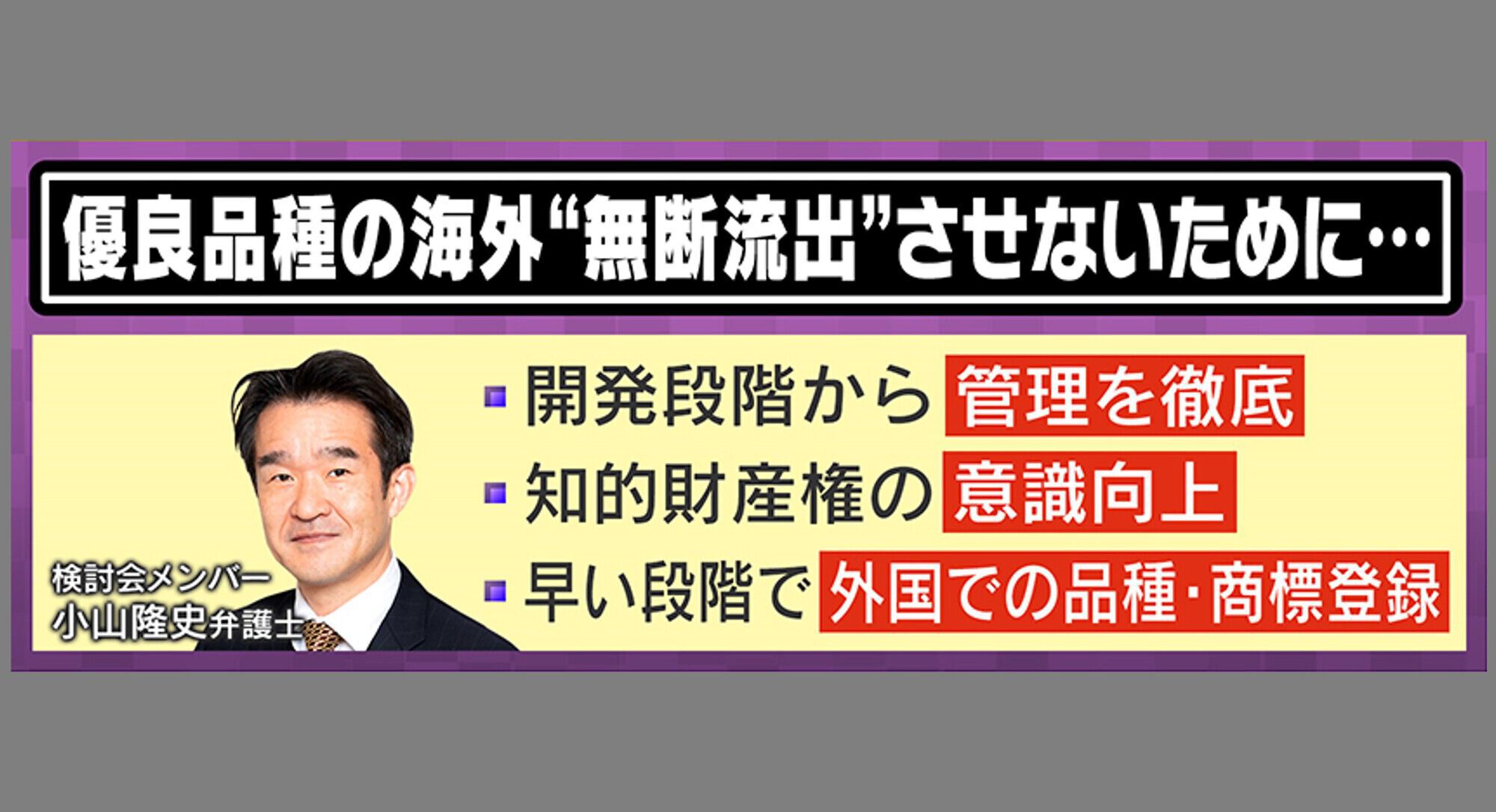 小山弁護士は、優良品種を海外に無断流出させないために必要なことは「開発段階からの管理を徹底、知的財産権の意識向上、早い段階で外国での品種・商標登録」だと言います。