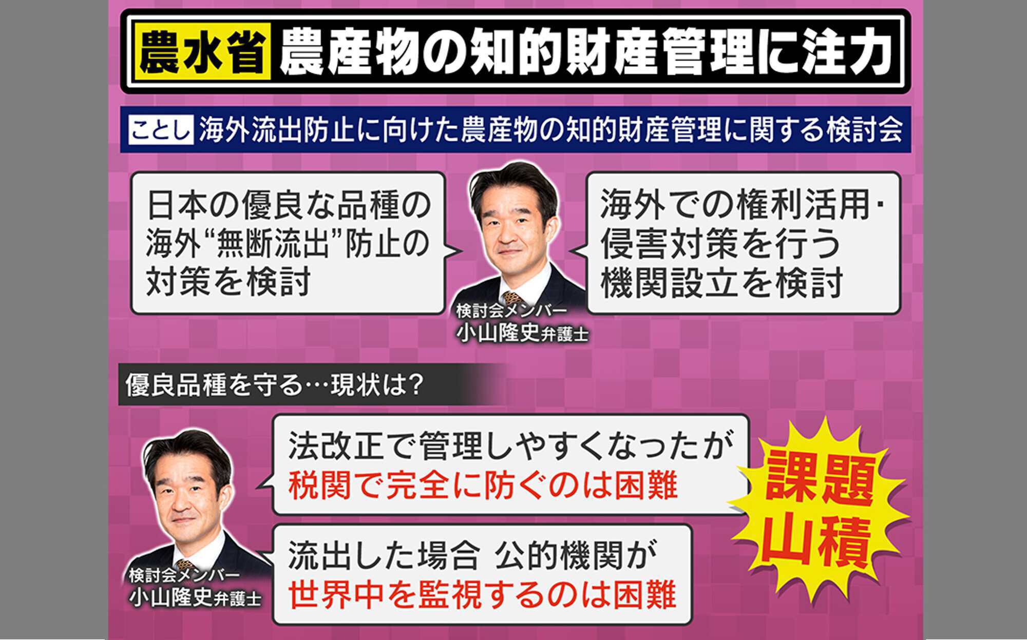 2022年に入ってから、政府の知的財産管理に関する検討会が立ち上がりました。海外での権利活用・侵害対策を行う機関の設立なども検討しているということです。現状、優良品種を守るための課題は山積みで、小山弁護士は「税関で完全に塞ぐのは困難、流出した場合に公的機関が世界中を監視するのも困難」ということです。