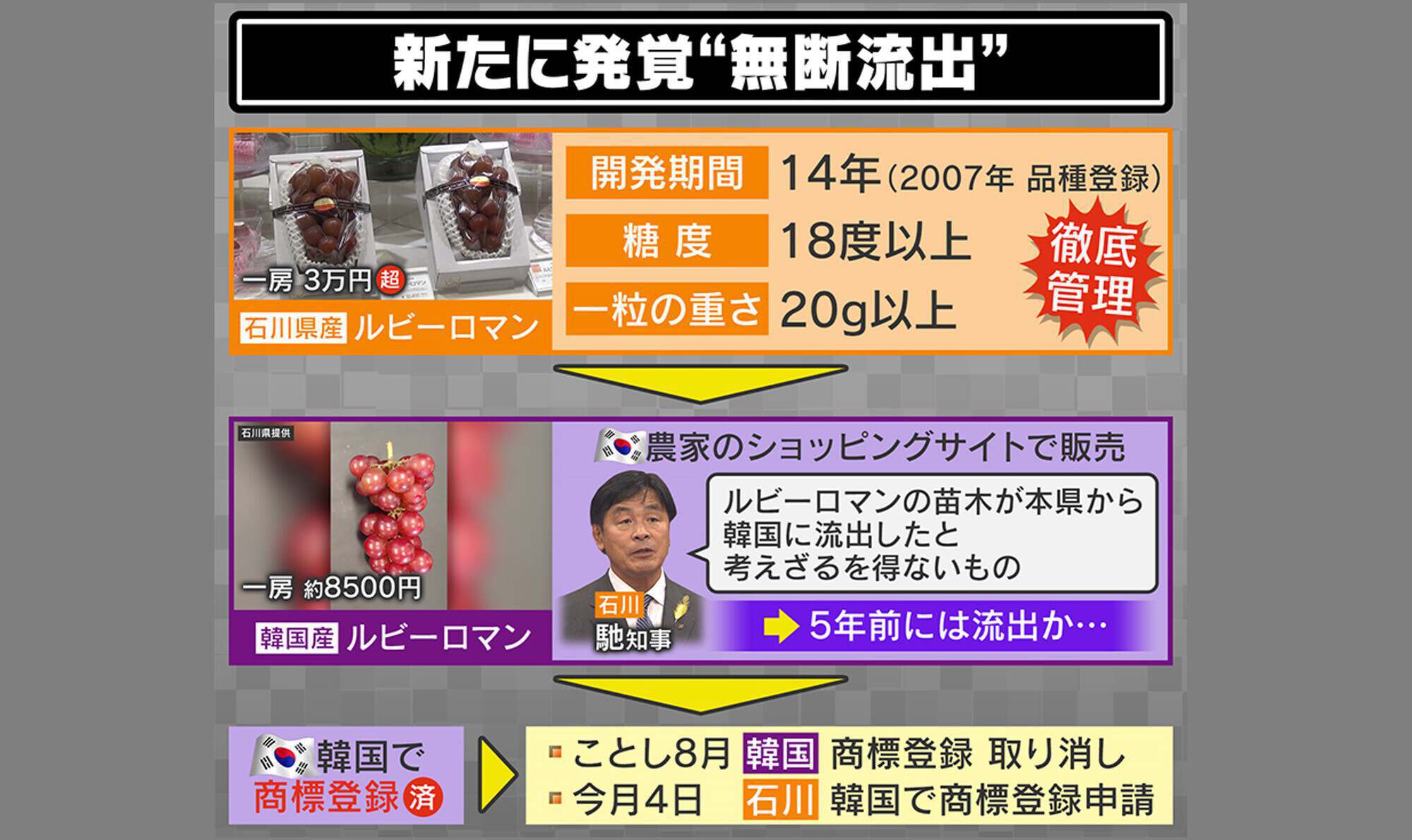 新たに流出が発覚した、石川県産の「ルビーロマン」は、都内の百貨店に並べば1房3万円もする高級品種ですが、韓国の農家のショッピングサイトでは、1房8500円で販売されていました。2021年夏、韓国国内で「ルビーロマン」と称するブドウが生産・販売されているとの報道を受け、石川県はこのブドウを韓国で購入し、日本の検査機関でDNA鑑定を実施。粒の大きさにばらつきがあるなど、見た目こそ違うものの、遺伝子の型が石川県産と一致しました。石川県の馳知事は「ルビーロマンの苗木が、本県から韓国に流出したと考えざるを得ないものであり、誠に遺憾である」としました。厳格に管理してきたはずの苗木が、5年前には流出したとみられています。また「ルビーロマン」は、韓国ですでに商業登録されていましたが、2022年8月に韓国がこれを取り消し、10月4日に石川県が、韓国で「ルビーロマン」の商標登録を申請したということです。