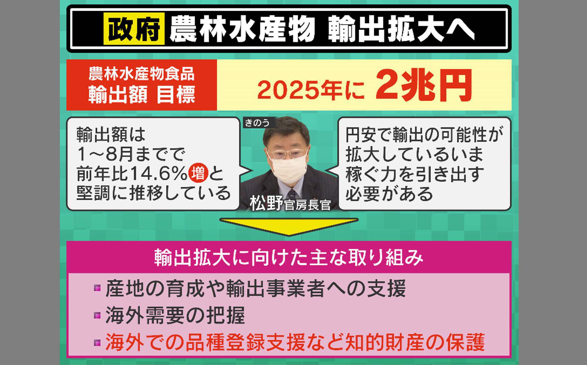 10月5日、輸出拡大のための関係閣僚会議で、松野官房長官は「円安で輸出の可能性が拡大している今、稼ぐ力を引き出す必要がある」と述べ、農林水産物食品輸出額の目標を2025年に2兆円としました。その上で、「海外での品種登録支援など、『知的財産』の保護活用の強化などについて、総合経済対策の中で具体化を進めてください」と発言しました。輸出で稼ぐ、そして流出を防ぐためにはどうすべきなのか。農林水産省の「海外流出防止に向けた農産物の知財管理検討会」のメンバーで、知的財産権問題に詳しい小山隆史(こやま・たかし)弁護士が解説します。