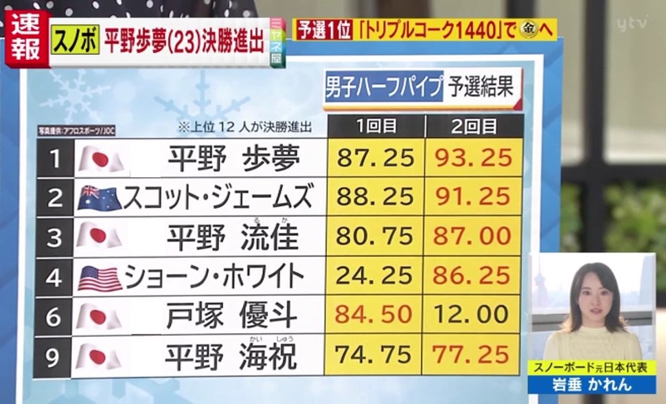 Q.平野歩夢選手の予選の成績は、100点満点中、1回目は87.25点、2回目は93.25点と、とてつもない安定感ですね?