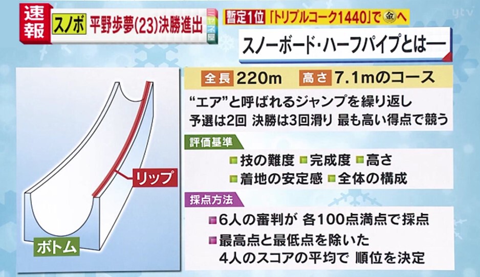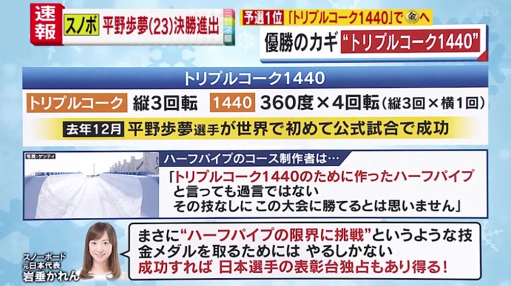 2月9日、北京オリンピック、スノーボード男子ハーフパイプ、平野歩夢(ひらの・あゆむ)選手が予選1位で決勝へ進みました。悲願の金メダルの“カギ“となる、超大技「トリプルコーク1440(フォーティーン・フォーティ)」のスゴさとは?スノーボード元日本代表の岩垂(いわだれ)かれんさんが解説します!