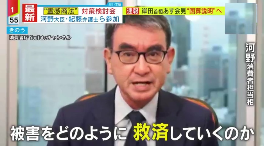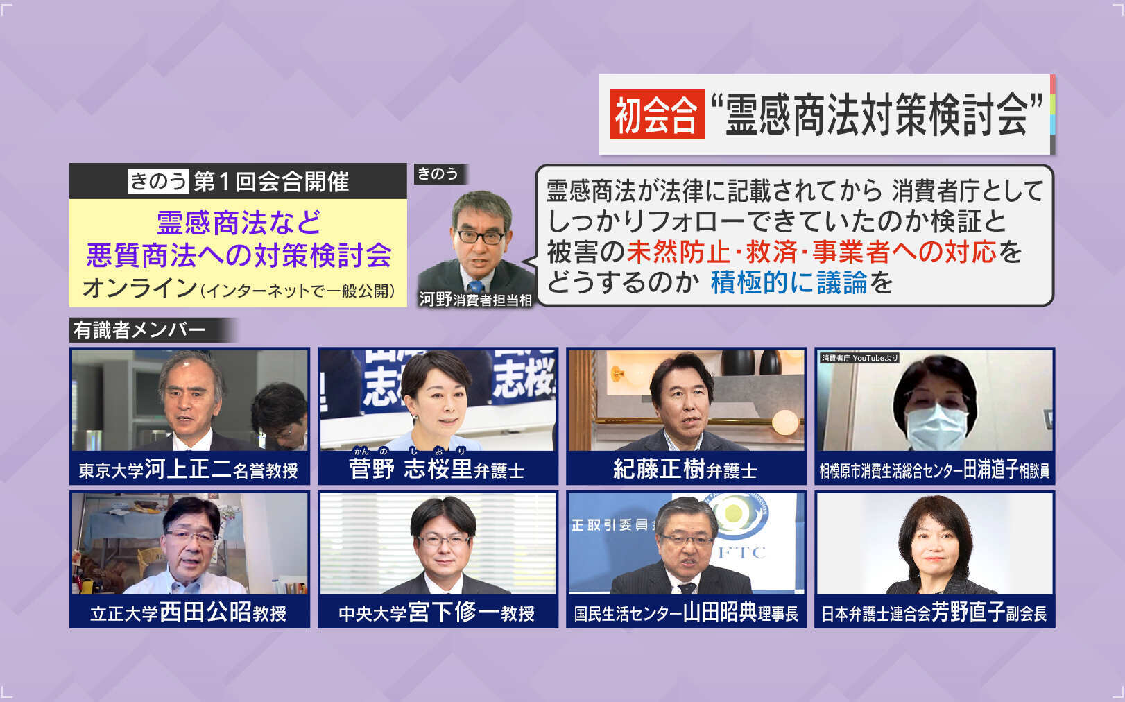 会合はインターネットで一般公開され、河野消費者担当相は「“霊感商法”は『物品の販売』ということだが、“寄付の問題”も指摘されている。『消費者契約法』のみならず『特定商取引法』といった、消費者庁が所管する法令の中でどのような対応ができるのか、遠慮なく議論をいただきたい。場合によっては、消費者庁の担当の枠を超え、政府に対して提言するということになるかと思う。境界を定めずにご自由にご議論いただきたい」とコメントしました。