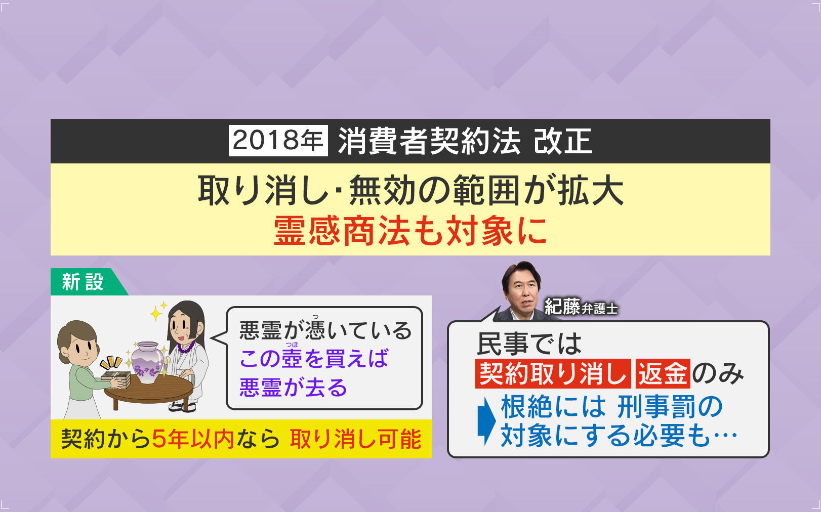 河野大臣が議論を促した2つの法律ですが、まず「消費者契約法」は2018年に改正され、取消・無効の範囲が拡大されました。「悪霊が憑いている。この壺を買えば悪霊は去る」と言った“霊感商法”も対象になり、契約から5年以内なら取消が可能となっています。