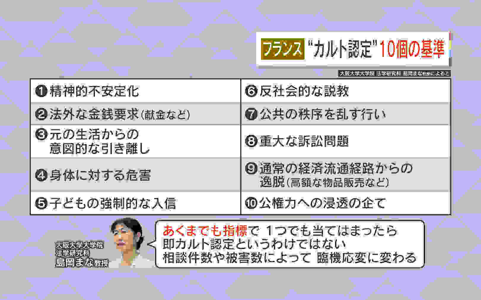 「解散命令は宗教法人法に定められています。しかしそれを出す基準が無いんです。無いことが混乱をきたしている原因なので、例えばフランスの『セクト規制法』などを参考に指標を作ることが重要だと思います。」