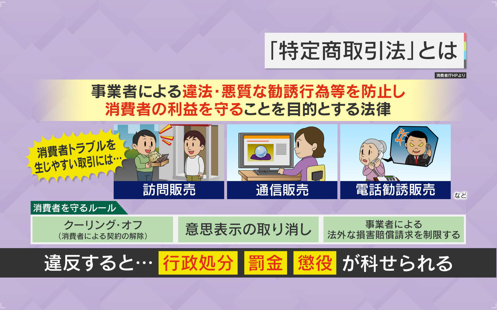 もう一方の「特定商取引法」は、商売の仕方自体を規制するもので、事業者による違法・悪質な勧誘行為等を防止し、消費者の利益を守ることを目的としています。違反すると「行政処分」「罰金」「懲役」が科せられます。
