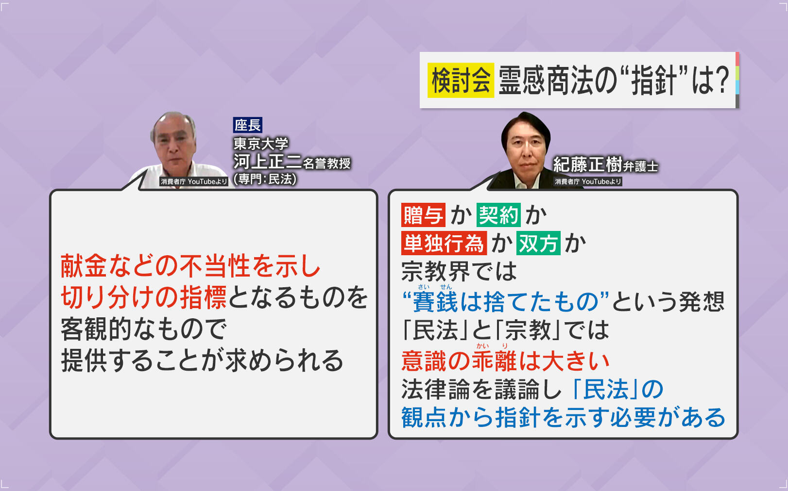 「『消費者契約法』は、契約を前提としています。形がないサービスも適用されるので、例えば“お祓い”であっても、お金を払って“お祓い”というサービスを提供されているので、契約になります。ただ、『献金』というものが民法上どういう性質のものか、はっきりしていないのです。『献金』は“贈与”なのか、“落としたもの”なのか、という議論さえあります。神様に捧げたものは、そこに“落としたもの”で、それを神主や住職がもらうという発想もあります。『無主物先占論』というのですが、持ち主がいないモノは誰がもらっても良いという考えです。『喜捨=喜んで捨てる』 という考えもあるので、法的に献金や寄付が『贈与』なのか『無主物先占』なのかという議論があって、法律上も民法学者の中でも定まっていないんです。ですので、まずは定めていただかないと、『消費者契約法』の対象になるかどうかも分からないんです。今回の会合に民法学者も二人入っていますので、二人にも検討していただきたいと思っています。『消費者契約法』の対象では無いとなると、新法を作らないといけません」