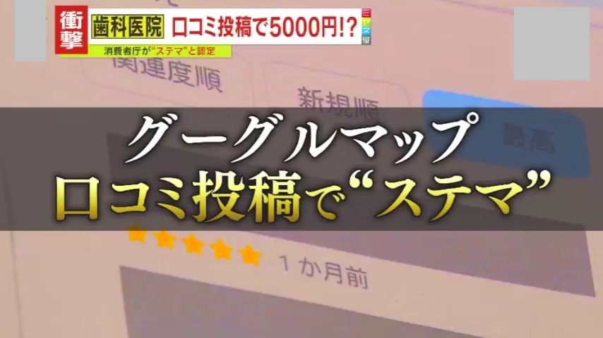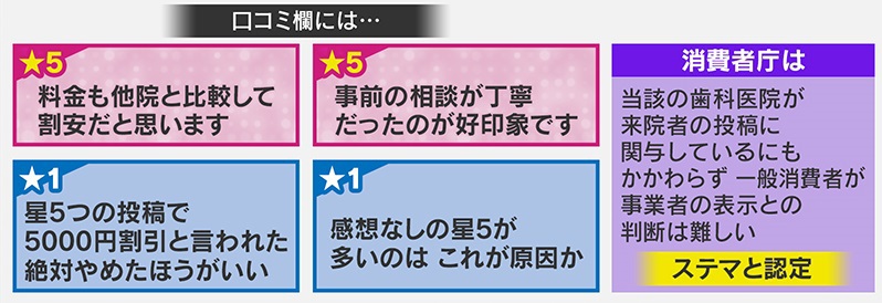 【驚き】患者に依頼し口コミ操作「星5が多いのは、これが原因か」「絶対やめたほうがいい」消費者庁がある歯科医院をステマ認定 さらに一般消費者も無自覚でステマに加担している恐れが―?