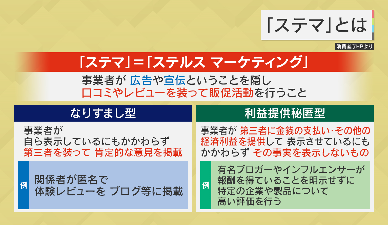 ステルスマーケティングというのは、事業者が広告、宣伝ということを隠して、口コミやレビューを装って販促活動を行うことです。