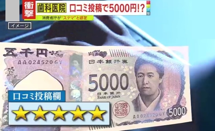 2024年5月から9月に、この歯科医院は来院した方に対し、グーグルマップの口コミに満点評価の星5をつけてほしいと依頼。来院者がその通り書き込むと、5000円分のQUOカードや、治療費5000円の割引を受けられたということです。