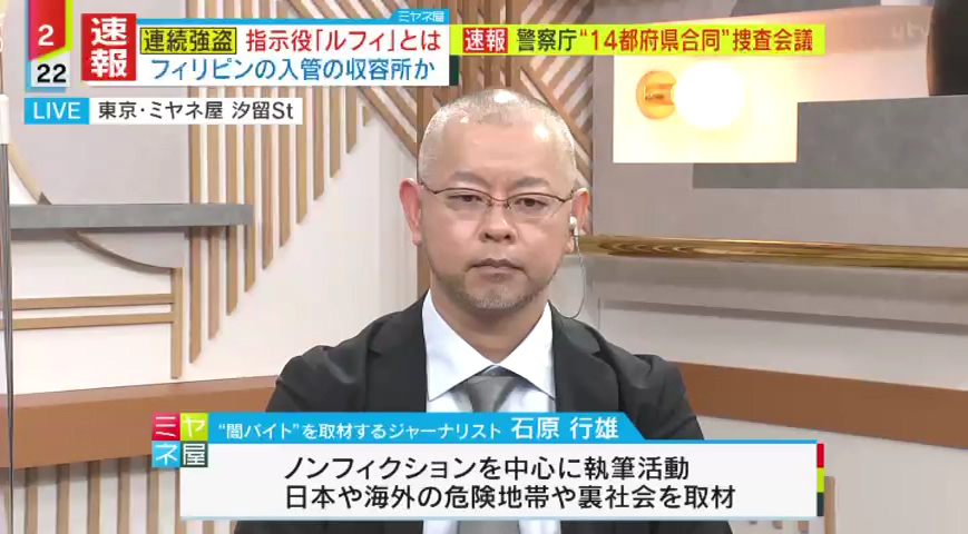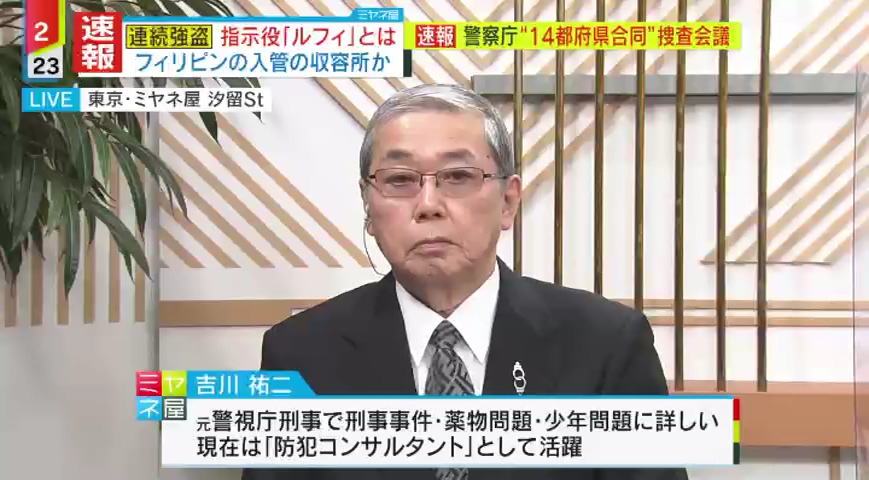 関東地方を中心に全国で相次いでいる強盗事件で、複数の事件で指示を出している疑いがある「ルフィ」と名乗る人物は、フィリピンにある入管施設の収容所にいる可能性があり、警察が関連を調べているということがわかりました。また、先月、東京・中野区で発生した強盗傷害事件の「指示役」は「KIM(きむ)」と名乗る人物だったこともわかりました。これらの事件について闇バイトの取材をするジャーナリストの石原行雄氏と元警視庁刑事の吉川祐二氏が解説します。