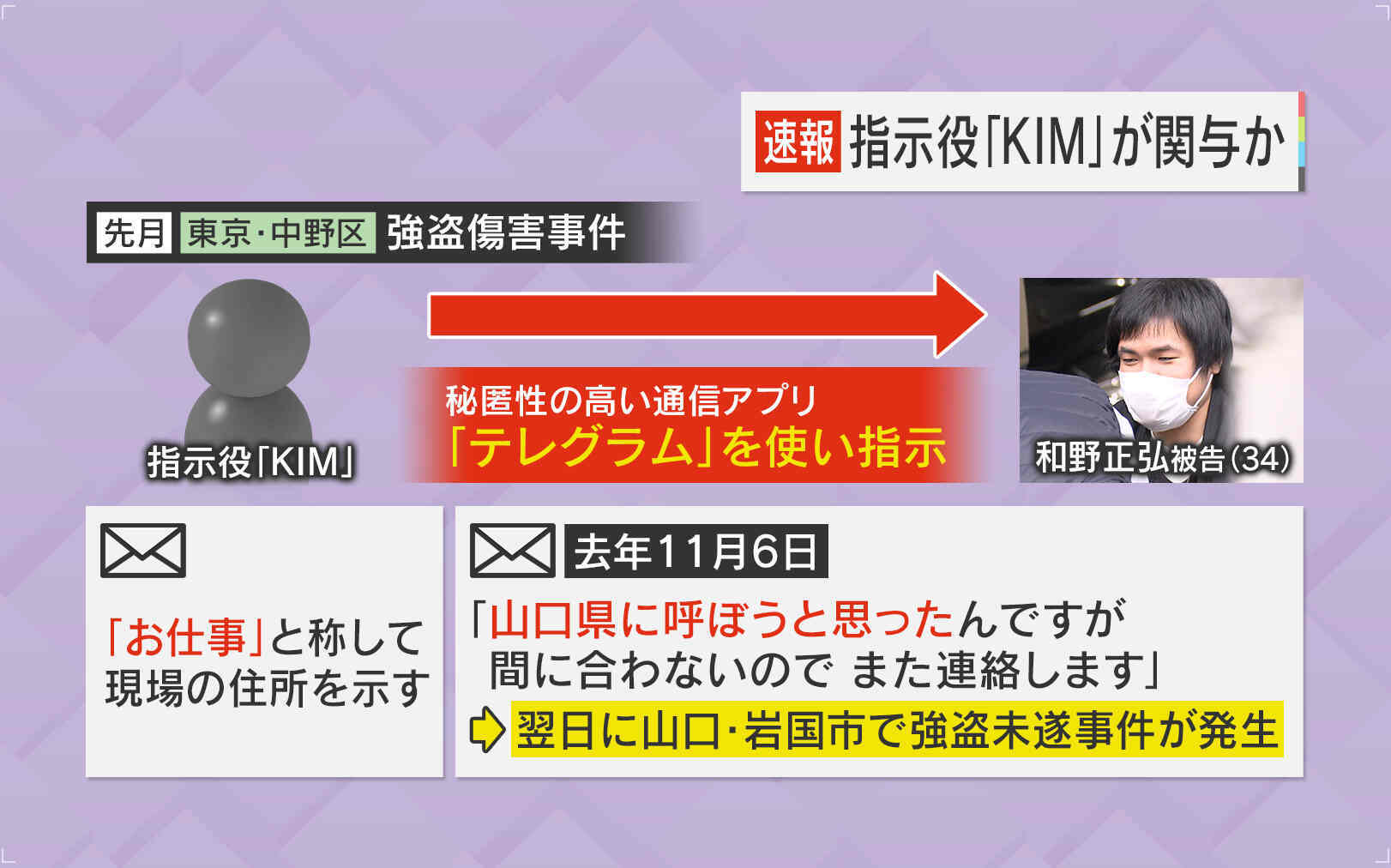 12月にあった中野区の強盗傷害事件で、指示役とされる「KIM」という人物は、秘匿性の高い通信アプリ「テレグラム」を使って実行役に指示を出していました。メッセージの中身は「お仕事」と称して現場の住所を示したり、2022年の11月6日には「山口県に呼ぼうと思ったんですが、間に合わないのでまた連絡します」というメッセージを送ったりしていました。実際にその翌日、山口県岩国市で強盗未遂事件が発生しています。