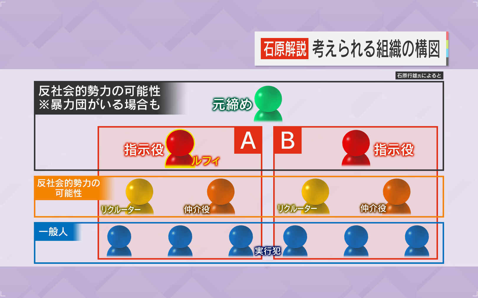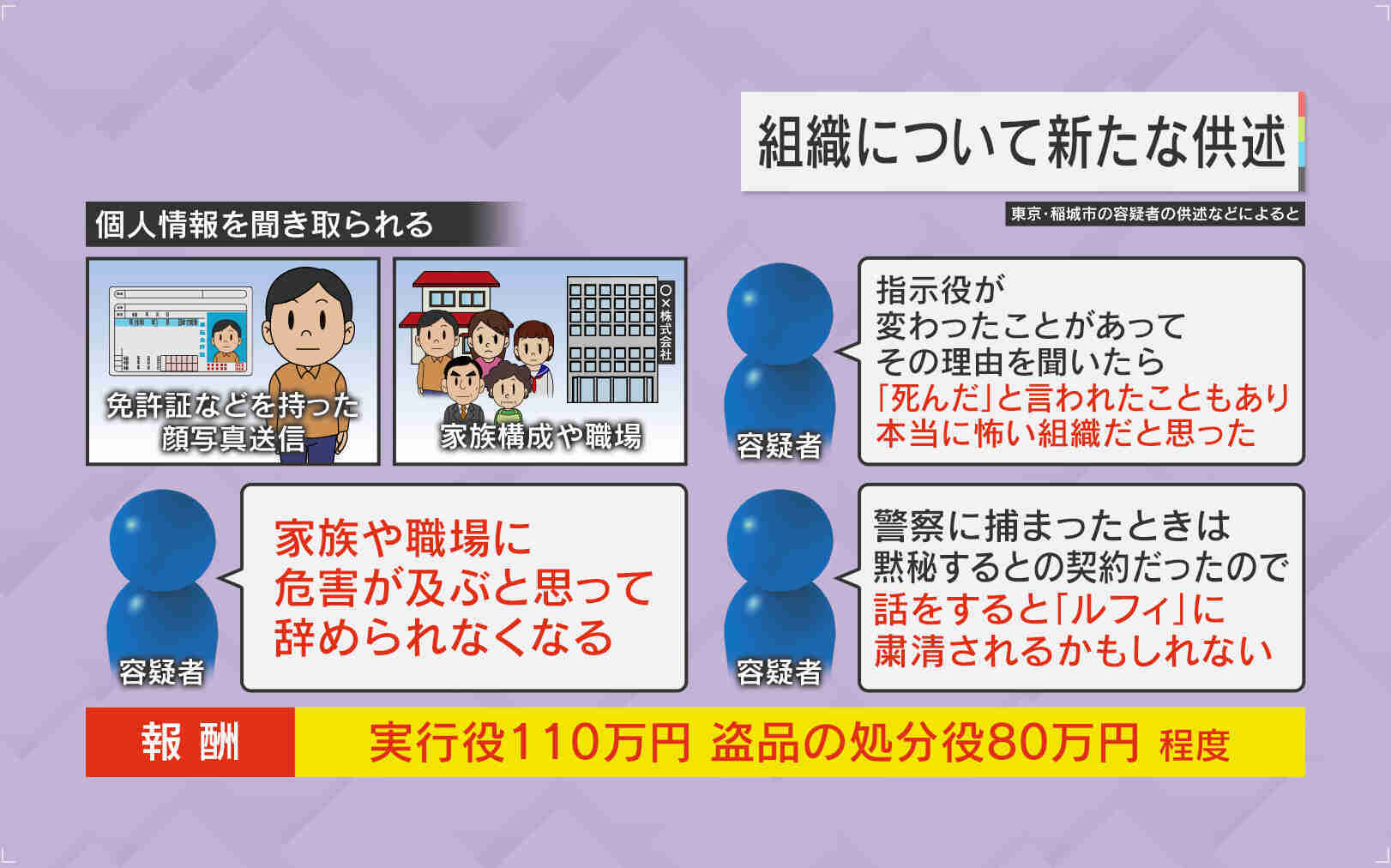 また、容疑者の供述によると、組織の上の人間に免許証などを持った顔写真を送ったり、家族構成や職場を聞きだされたりするなど個人情報を握られてしまい、家族や職場に危害が及ぶと思って辞められなくなるということです。また、「指示役が変わったことがあって、その理由を聞くと『死んだ』といわれ本当に怖い組織だと思った」「警察に捕まったときは黙秘をする契約だったので、話をすると『ルフィ』に粛清されるかもしれない」などとも供述しています。報酬は、実行役が110万円で盗品の処分役が80万円程度だということです。