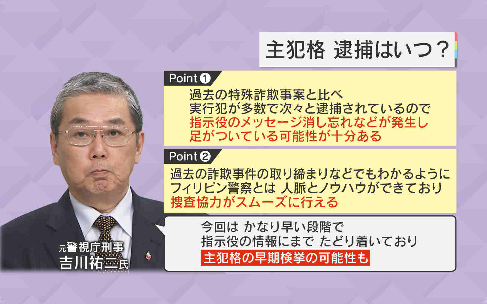 吉川氏は今回の事件の主犯格逮捕について「過去の特殊詐欺事案と比べ、実行犯が多数で次々と逮捕されているので、指示役のメッセージ消し忘れなどが発生し、足がついている可能性が十分ある」としています。また「フィリピン警察とは人脈とノウハウができており、捜査協力がスムーズに行える」ことを挙げて、「主犯格の早期検挙の可能性もあり得る」といいます。