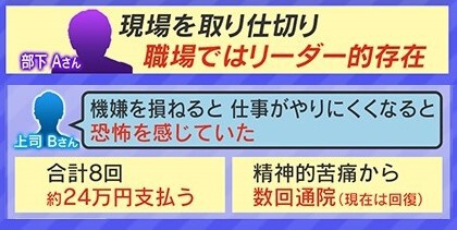 上司のB氏は合計8回、合わせて約24万円を支払ったといい、精神的苦痛で数回通院する事態になったということです。(現在は回復)