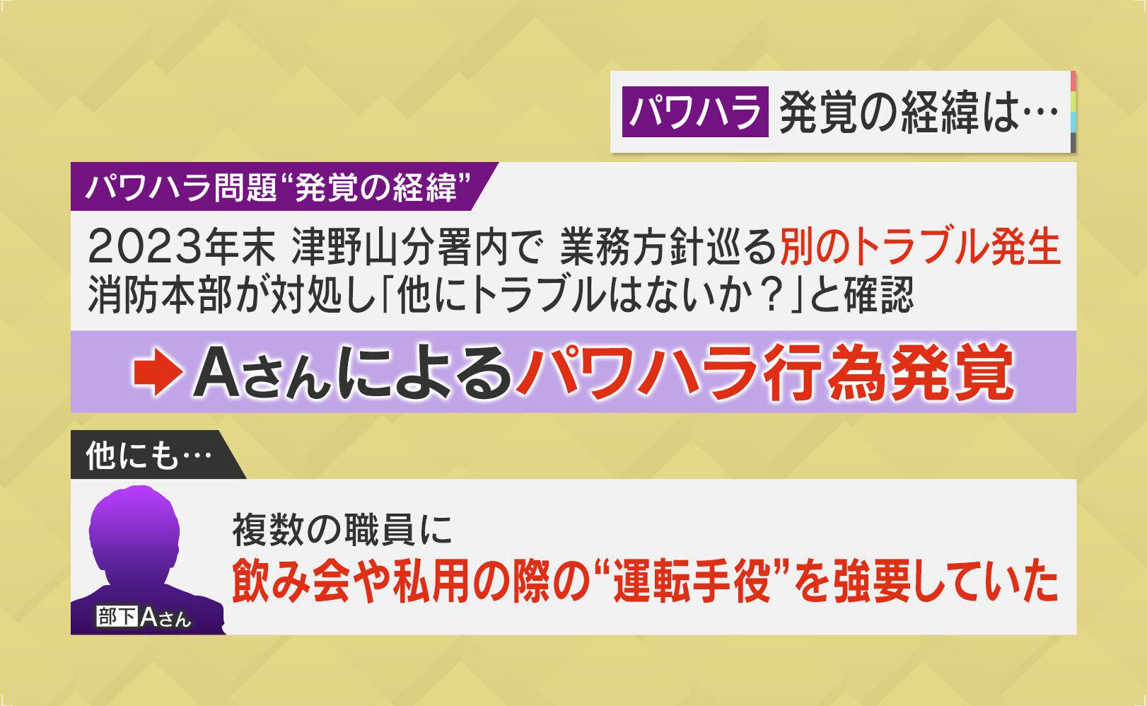 この問題の発覚の経緯は2023年末、津野山分署内で業務方針巡る別のトラブルが発生し、消防本部が対処した際に「ほかにトラブルはないか?」と確認したところ、A氏によるパワハラ行為が発覚したということです。また、ほかにもA氏は複数の職員に飲み会や私用の際の“運転手役”を強要していたということです。