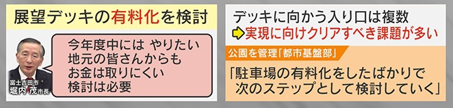 富士吉田市は、さらなる対策として『展望デッキ』の有料化を検討しています。堀内茂市長は「今年度中にはやりたい。地元の皆さんからもお金は取りにくい。検討は必要」と話していますが、デッキに向かう入り口は複数あり、実現に向けクリアすべき課題が多いということです。公園を管理する『都市基盤部』は、「駐車場の有料化をしたばかりで、次のステップとして検討していく」としています。