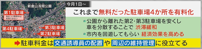 こうした事態に対応するため、富士吉田市は2025年2月に公園周辺にある駐車場4か所を有料化する条例を可決し、同年4月1日から開始しました(同月18日まで開催されている『桜まつり』の期間中、第1駐車場は利用不可)。公園から離れた第2・第3駐車場を安くし、車を分散することで渋滞緩和、さらに市内を回遊してもらい経済効果を高める狙いがあります。駐車料金は、交通誘導員の配置や周辺の維持管理に役立てるということです。
