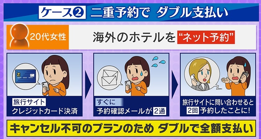 次に、『二重予約でダブル支払い』となったケースです。海外のホテルをネット予約した女性(20代)が、旅行サイトでクレジットカード決済したところ、すぐに予約確認のメールが2通届きました。旅行サイトに問い合わせると、2回予約したことになっていて、キャンセル不可のプランだったためダブルで全額支払ったということです。