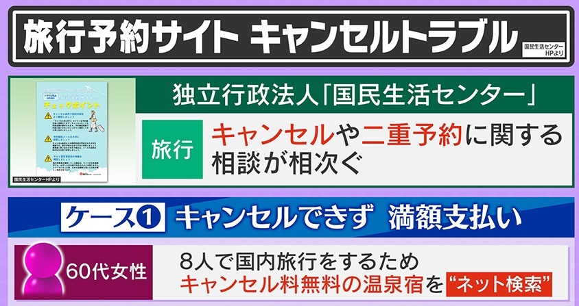 今、旅行トラブルに関する相談が『国民生活センター』に相次いでいます。まずは、『キャンセルできず満額支払い』となったケースです。女性(60代)は8人で国内旅行をするため、「キャンセル料無料の温泉宿」をネット検索し、ある旅行予約サイトで5か月後の予約(約8万円)を取りました。しかし、2時間後にキャンセルすると、100%のキャンセル料が発生したといいます。